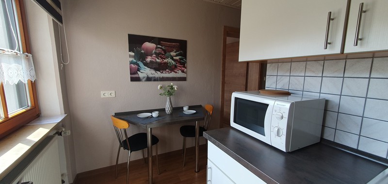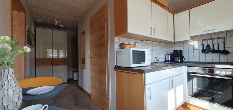 Eine Wohnung mit 30 qm für 2 Personen, ein Wohn-Schlafraum mit Doppelbett, Küche mit Mikrowelle, Kaffeemaschine, Toaster und Essecke. Dusche mit Waschbecken und WC. Sat - Fernsehen und ein DSL - Anschluß steht für Sie bereit. Die Wohnung ist mit einer Zentralheizung ausgestattet!